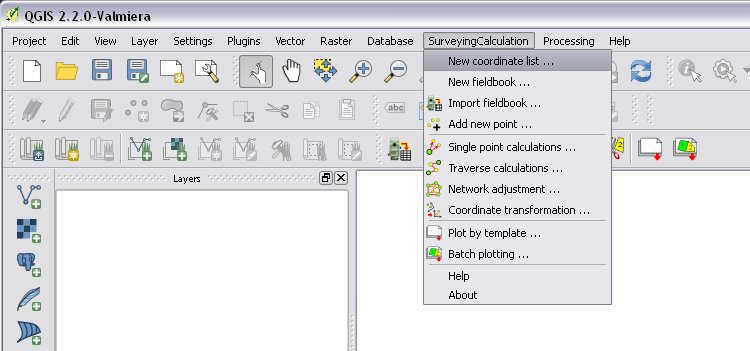 Most of the cases you need an open coordinate list to store calculation results. Open an existing QGIS project which contains a coordinate list (a point shape file whose name have to start with coord_) or create a new project and add an existing coordinate list to the project by the add vector layer icon or create a new project and create a new coordinate list from the SurveyingCalculation/New coordinate list ... menu.
