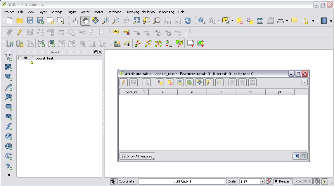 After loading an existing one or creating a new Coordinate list shape file, you get a point layer in your project with the following columns in the attribute table (column names and types are mandatory):