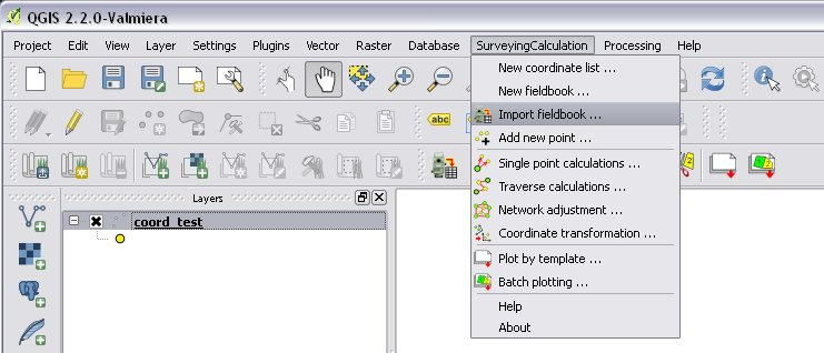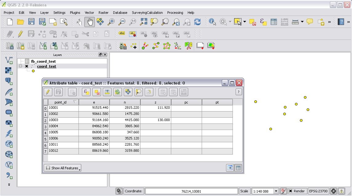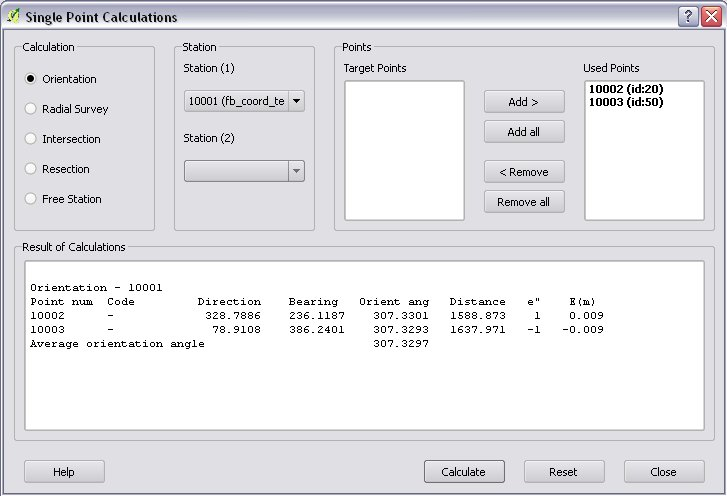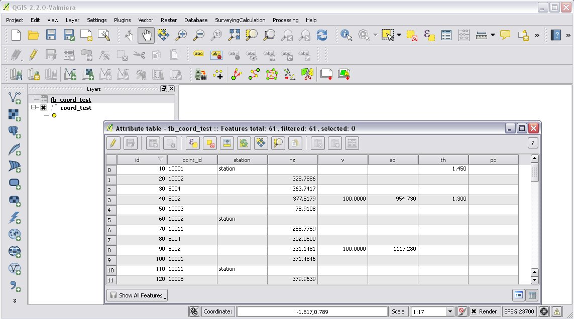 During the calculations the plug-in will use the data from the opened fieldbooks (fb_ tables) and from the opened coordinate list (coord_ layer).