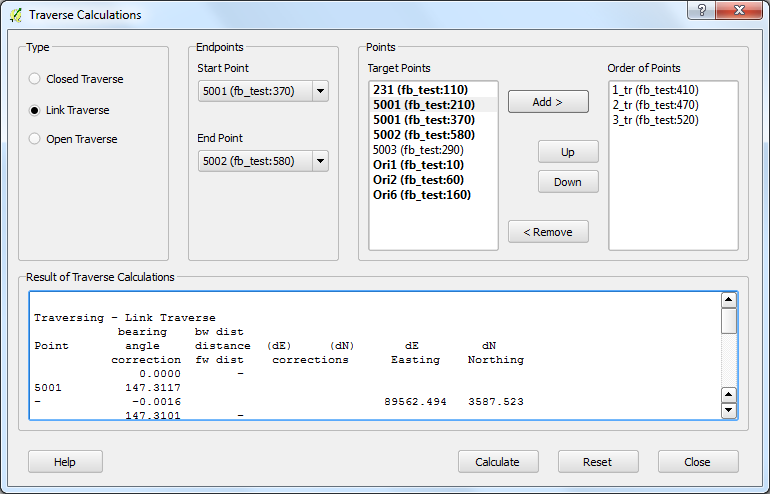 During the traverse calculations the plug-in will use the data from the opened fieldbooks (fb_ tables) and from the opened coordinate list (coord_ layer).