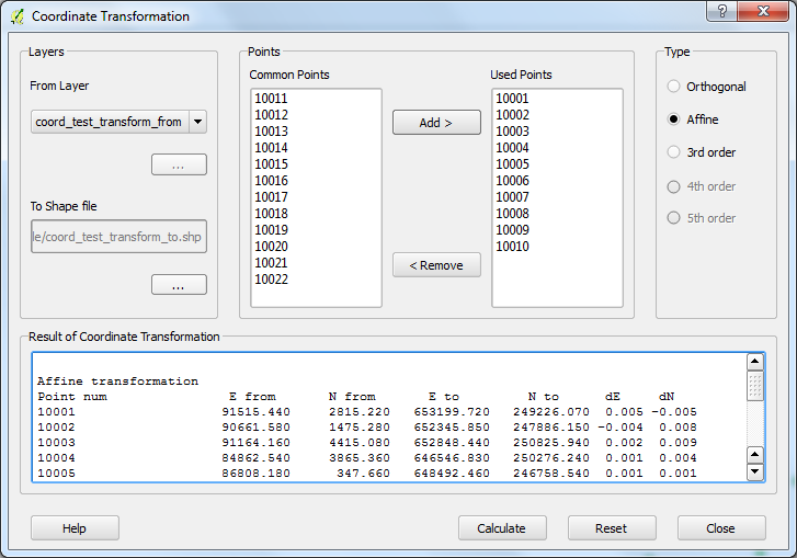 The plug-in provides different types of transformation. The calculation of the transformation parameters uses the least squares estimation if you select more common points than the minimal neccessary.