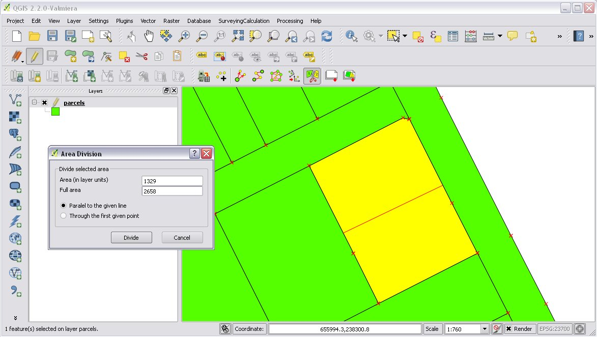 With the Polygon Division tool you can divide a parcel into two at a given area. There are two possible division types: