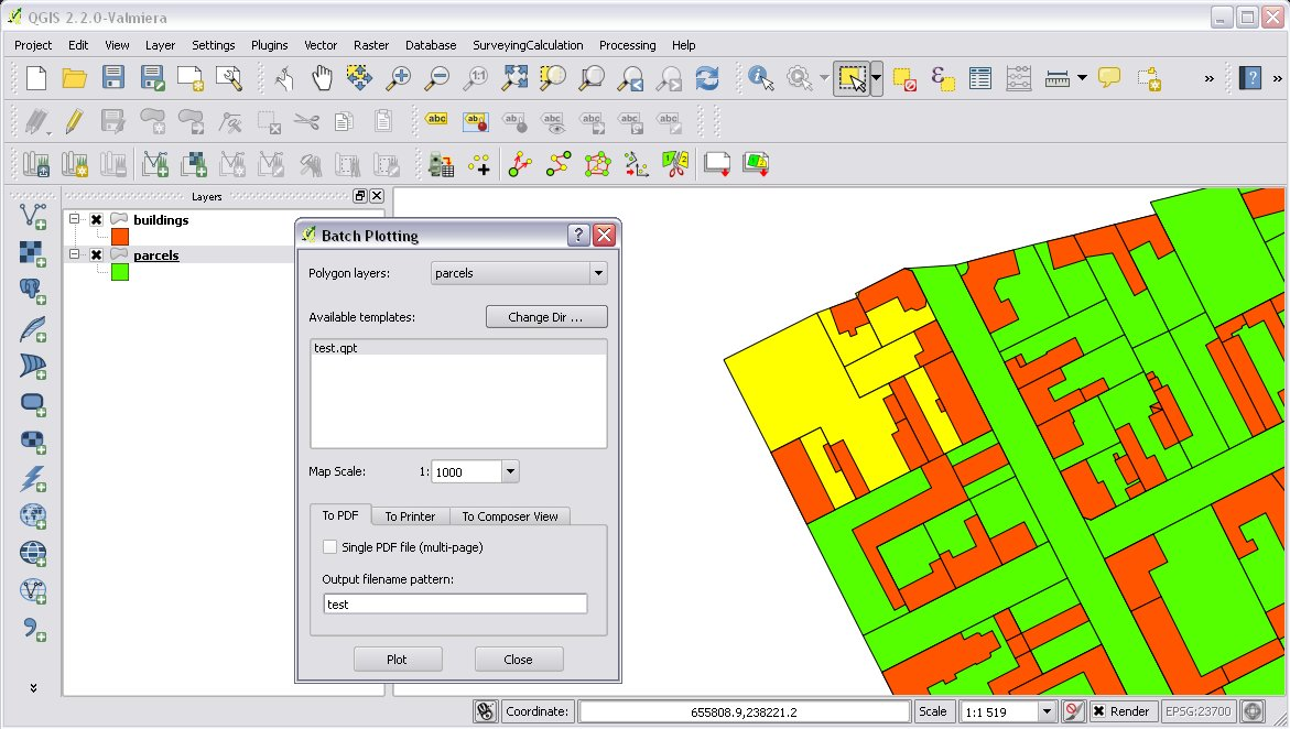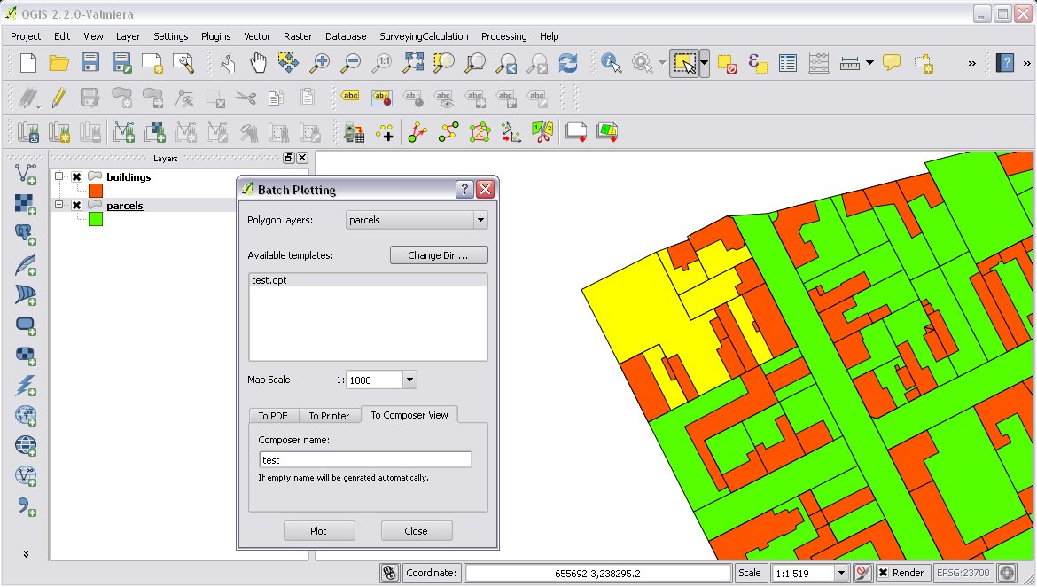 With the “Batch plotting” command you can plot selected polygons from one layer using a composer template file. Batch plotting creates a QGIS atlas composition, which is a multi-page composition. One polygon will be on one page. In the dialog you can choose the output of the plot.
